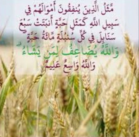 ( مَّثَلُ الَّذِينَ يُنفِقُونَ أَمْوَالَهُمْ فِي سَبِيلِ اللَّهِ كَمَثَلِ حَبَّةٍ أَنبَتَتْ سَبْعَ سَنَابِلَ فِي كُلِّ سُنبُلَةٍ مِّائَةُ حَبَّةٍ ۗ وَاللَّهُ يُضَاعِفُ لِمَن يَشَاءُ ۗ وَاللَّهُ وَاسِعٌ عَلِيمٌ ) . الآية (261)