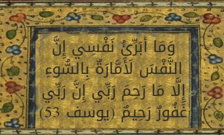 قال تعالى ( وَمَا أُبَرِّئُ نَفْسِي ۚ إِنَّ النَّفْسَ لَأَمَّارَةٌ بِالسُّوءِ إِلَّا مَا رَحِمَ رَبِّي ۚ إِنَّ رَبِّي غَفُورٌ رَّحِيمٌ) سورة يوسف ٥٣