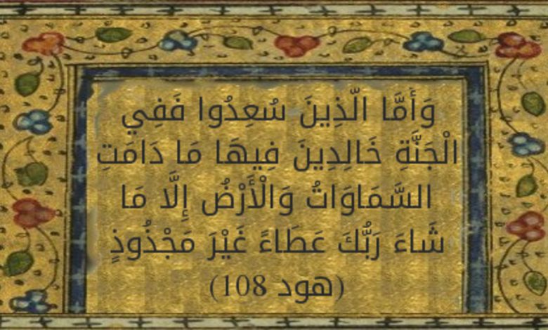 (  وَأَمَّا الَّذِينَ سُعِدُوا فَفِي الْجَنَّةِ خَالِدِينَ فِيهَا مَا دَامَتِ السَّمَاوَاتُ وَالْأَرْضُ إِلَّا مَا شَاءَ رَبُّكَ ۖ عَطَاءً غَيْرَ مَجْذُوذٍ )   الآيه ١٠٨
