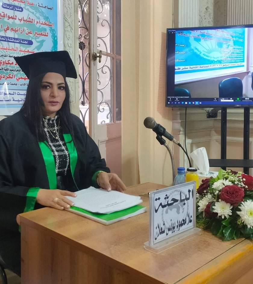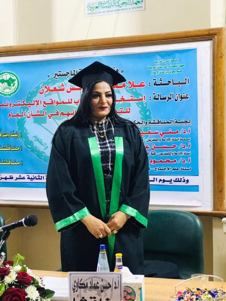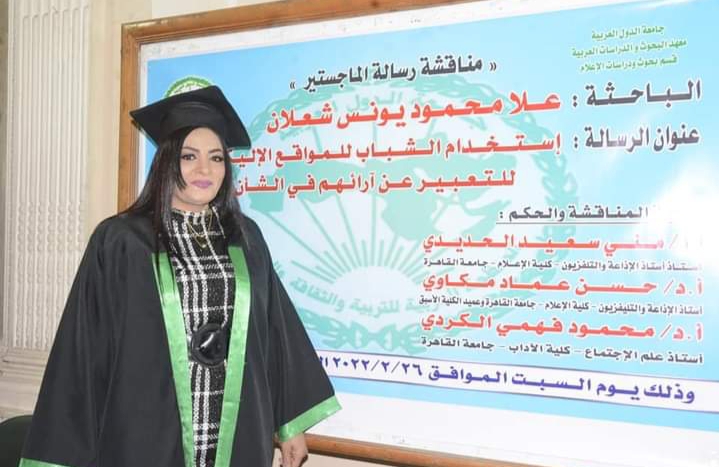 تهنئ الإعلامية شيماء عطا زميلتها الباحثة علا محمود يونس شعلان لحصولها على درجة الماجستير بتقدير إمتياز عن رسالتها ” إستخدام الشباب للمواقع الإلكترونية للتعبير عن آرائهم في الشأن العام ” .