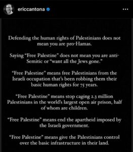 فيما اعتبره المراقبون والمحللون منشورا تاريخيا كتب لاعب كرة القدم الفرنسي ومانشستر يونايتد السابق ايريك كانتونا تدوينة على موقع انستجرام يدعم فيها أهل فلسطين جاء فيها: