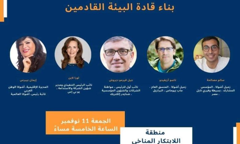 في إطار القمة العالمية للمناخ COP 27 التي يتم عقدها حاليًا في مدينة شرم الشيخ 2022، من أجل مكافحة التغيرات المناخية، الذي يعاني منها الكثير من بلدان العالم ، تشارك أشوكا الوطن العربي في فعاليات القمة، بادارة حلقة نقاشية بعنوان “بناء قادة البيئة القادمين” يوم الجمعة الموافق 11 نوفمبر الساعة 5 مساءً في منطقة العمل المناخي بالشراكة مع Kite Insights