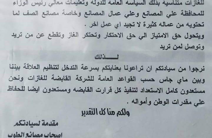 أوضح حسانين، أن مايا جاس تقوم بفرض تعليمات نابعة منها مخالفة لقرارات وتعليمات الشركة القابضة للغازات وهي تؤثر على عمل المصانع، وتحول حق الامتياز لها بتوصيل الغاز إلى حق احتكار توصل لمن تريد وتقطع الغاز عن من تريد، مطالبا وزير البترول بالتدخل لتنظيم العمل بين المصانع وشركة مايا جاس وأن تطبق الشركة تعليمات وقرارات الشركة القابضة للغازات للحفاظ على المستثمرين ودعمهم وتنفيذا لتعليمات الدولة لتنمية الاستثمار وجذب المستثمرين .