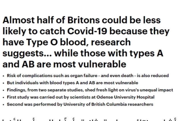ووفقا لتقرير لصحيفة ديلى ميل البريطانية استخدم الباحثون الدنماركيون بيانات من 473 ألف فرد تم اختبارهم لـCovid-19 ضد مجموعة مراقبة تضم أكثر من 2.2 مليون شخص من عامة السكان، ومن بين أولئك الذين ثبتت إصابتهم بالفيروس، وجدوا عددًا أقل من الأشخاص المصابين بفصيلة الدم O والمزيد من الأشخاص الذين يعانون من أنواع A و B و AB.