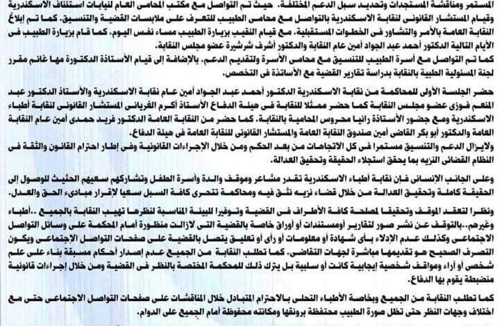 وناشد مجلس نقابة أطباء الإسكندرية في بيانه الأطباء بعدم تداول مستندات أو شهادات تخص القضية على مواقع التواصل الاجتماعي لاحتمال إضرارها بسير التحقيقات وطالب المجلس من لديه مستندات أو شهادات أن يتواصل مع نقابة الأطباء أو تقديمها إلى جهات التحقيق المختصة.