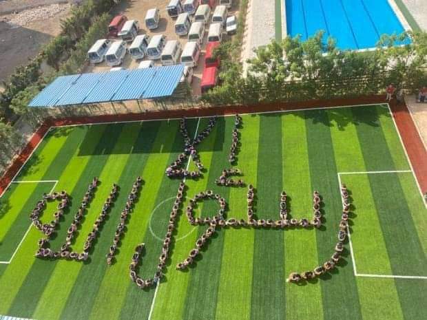 لفتة طيبة من طلاب مدرسة جراند بالإسكندرية للتعبير عن رفضهم للإساءة للنبي صلى الله عليه وسلم حيث قاموا بكتابة ‘الا رسول الله’بأجسامهم ليرسموا لوحة فنية رائعة وراقية.