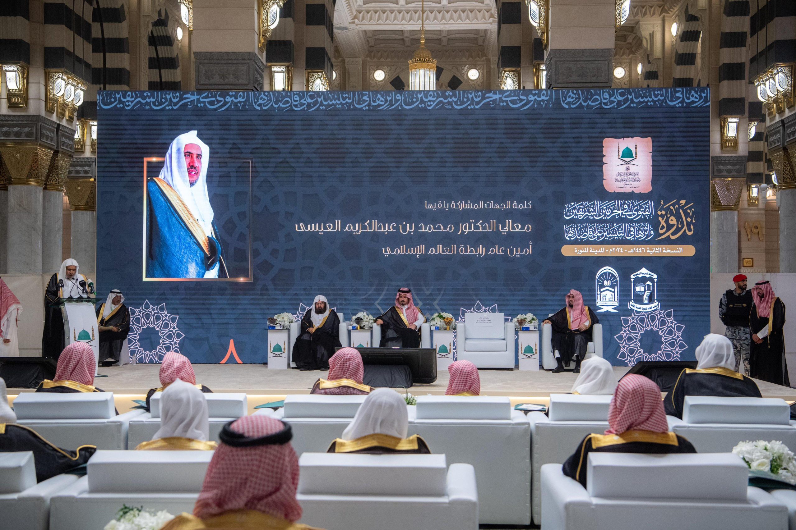 إثر ذلك، شاهد الحضور عرضاً مرئياً عن ندوة الفتوى في الحرمين الشريفين وأثر ذلك في التيسير على قاصديهما، ثم ألقى معالي الأمين العام لرابطة العالم الإسلامي فضيلة الشيخ الدكتور محمد بن عبدالكريم العيسى، كلمة الجهات المشاركة في أعمال الندوة، جاء فيها: نسعد اليوم بلقاء علمي، يتابع تأصيله الشرعيّ، في موضوع له حِوَارٌ، وعليه مدار، وهو الفتوى في الحرمين الشريفين، وأثرُها في التيسير على قاصديهما، ولا يخفى على الحضور الكريم أن الفتوى في هذا الشأن لها مساران، الأول فتوى عامة، فيما يَحتاج إليه قاصدو الحرمين الشريفين من البيان الشرعي، والآخر فتوى خاصة تتعلق بظرفية القاصد فيما يخصه وأمثالَهُ مِنْ حُكم شرعي دُون سواهم، وذلك فيما تختلف به الفتاوى والأحكام باختلاف الأحوال.