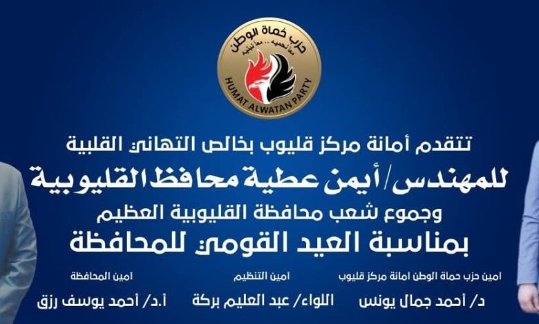 يتقدم الدكتور أحمد جمال يونس، أمين حزب حماة الوطن بمركز قليوب، بخالص التهاني إلى المهندس ايمن عطية محافظ القليوبية، وكافة مواطنيها الكرام، بمناسبة العيد القومي للمحافظة، الذي يوافق 30 أغسطس 2025.