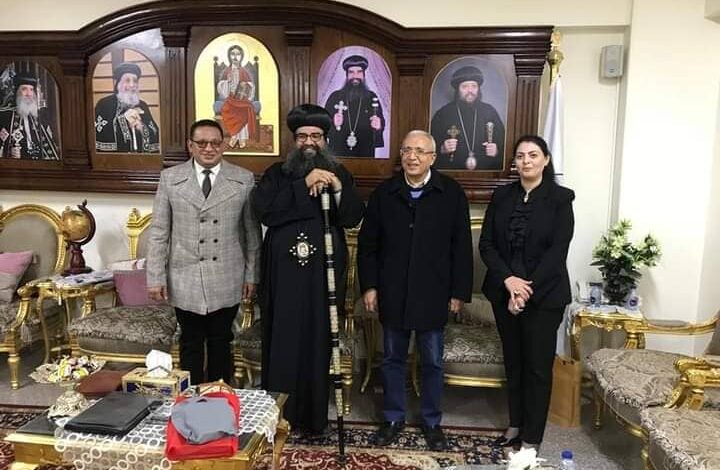 استقبل نيافة الأنبا بيسنتى مطران أبنوب والفتح واسيوط الجديدة للأقباط الارثوذكس المهندس ياسر عمر أمين حزب مستقبل وطن بمحافظة أسيوط ووكيل لجنة الخطة والموازنة بمجلس النواب والنائبة هند جوزيف عضو مجلس الشيوخ وأسامة البرنس أمين الصناعة والتجارة بأمانة أول أسيوط بحزب مستقبل وطن