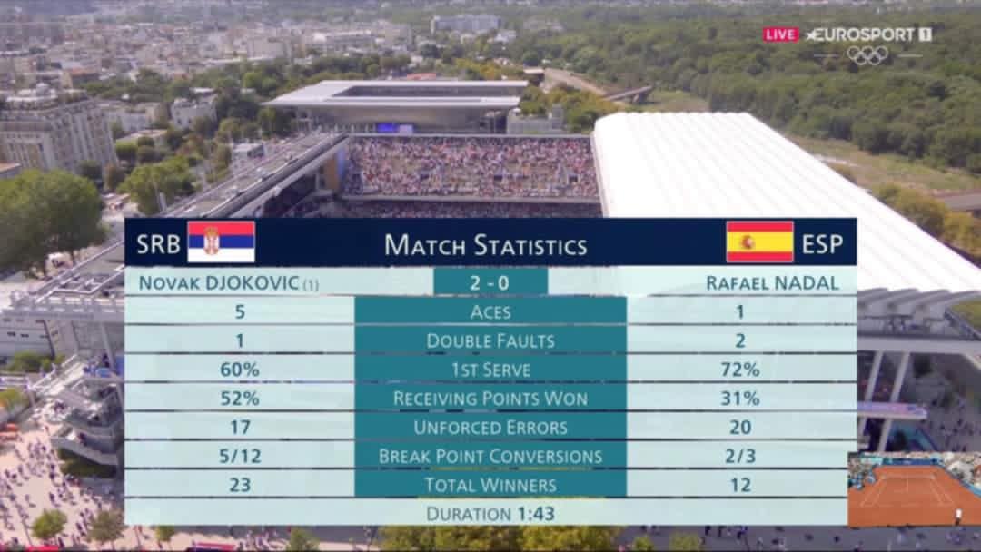 نوفاك دجوكوفيتش يهزم رافائيل نادال بمجموعتين متتاليتين 6-1 6-4 ليتأهل إلى الدور الثالث في دورة الألعاب الأولمبية في انتظار الفائز من لقاء ماتيو ارنالدي ودومنيك كوبفر.