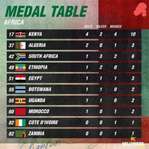 والآن وبعد حصول مصر على ميدالية ذهبية، ارتقى “الفراعنة” في قائمة الترتيب ليصبح في المركز الـ50 بواقع: ميدالية ذهبية – ميدالية فضية – ميدالية برونزية.