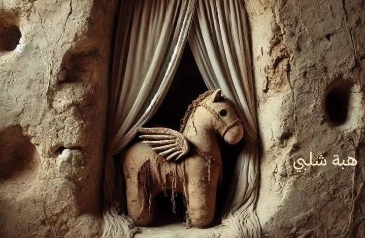 فلما سيدنا النبي صلى الله عليه وسلم دقق النظر في الألعاب لمح من ضمنهم حصان مصنوع من الجلد أو القماش وله جناحان، فشاور صلى الله عليه وسلم عليه وسأل السيدة عائشة وقالها:”ما هذا الذي أرى وَسَطَهُنَّ “