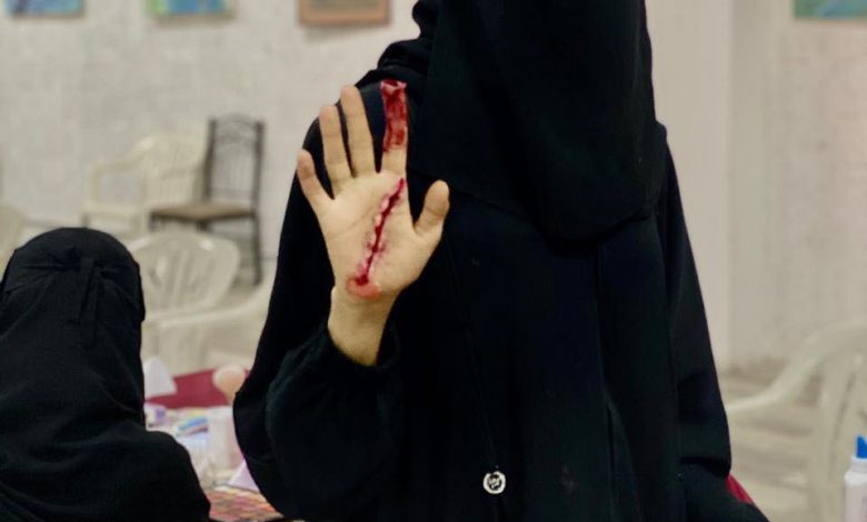 وشرحت المدربة زهراء كذلك أساسيات المكياج والخدع والجروح ‘ومنها الدموي  والفنتازي والمسرحي’