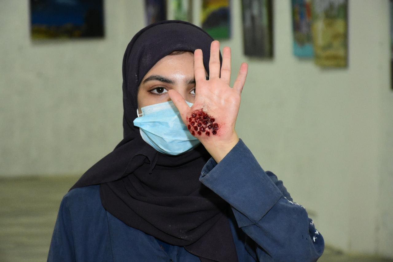 وشرحت المدربة زهراء كذلك أساسيات المكياج والخدع والجروح ‘ومنها الدموي  والفنتازي والمسرحي’