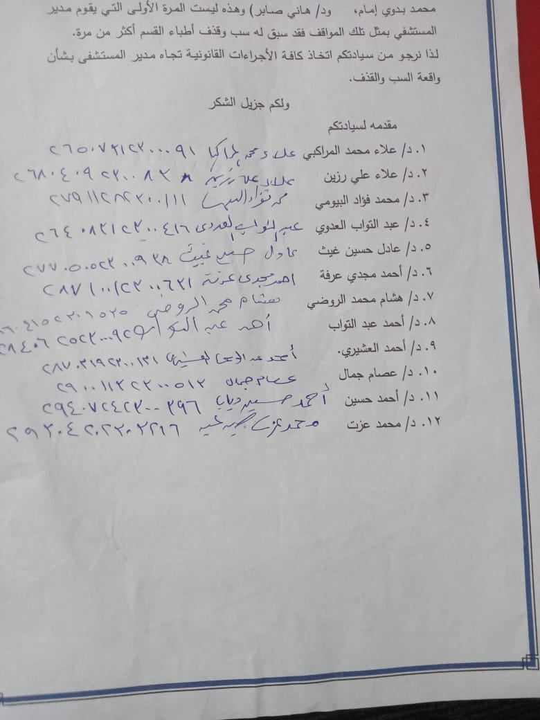 وأرفق الأطباء تسجيل صوتي للمدير وهو يسبهم بالفاظ نابية تشمل الأم والأب.