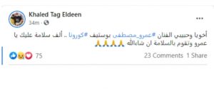 وكتب الشاعر خالد تاج الدين عبر حسابه على موقع فيس بوك: “أخويا وحبيبى الفنان عمرو مصطفى بوستيف كورونا.. ألف سلامة عليك يا عمرو وتقوم بالسلامة إن شاء الله”، وما إن كتب ذلك حتى تفاعل معه الكثيرون من محبى عمرو مصطفى ممن حرصوا على الدعاء له.