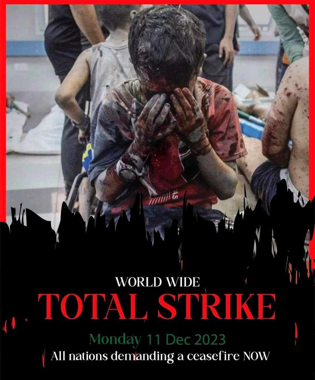 دعت منظمات حقوقية فلسطينية وعربية وعالمية ونشطاء ومؤثرون إلى إضراب عالمي شامل، غدا الاثنين المقبل 11 ديسمبر 2023 لوقف الحرب علي غزة .وقالت تلك المنظمات في بيان يوم امس السبت 9 ديسمبر : “لا بد من شل حركة الحياة والعجلة الاقتصادية في الدول كلها، حتى يشعر الجميع أنه متأثر على نحو مباشر إثر العدوان على غزة، ومن ثم يُضْغَط لوقف الحرب”.