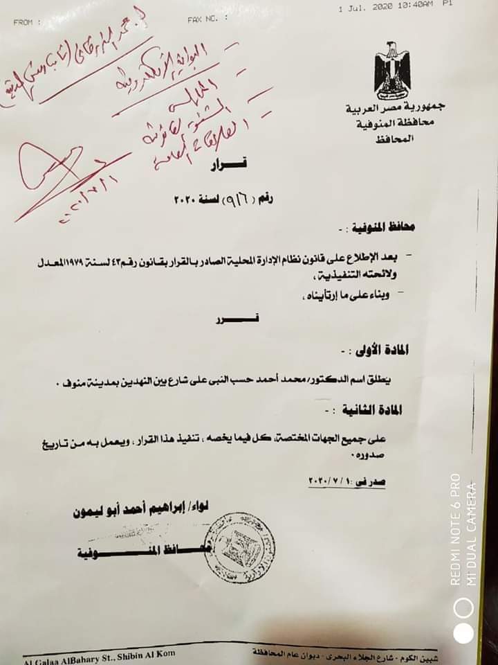 أصدر اليوم اللواء إبراهيم أحمد أبو ليمون محافظ المنوفية قرار رقم (٩١٦) لسنة ٢٠٢٠ بإطلاق اسم الدكتور محمد أحمد حسب النبي وكيل مستشفي حميات منوف علي أحد شوارع المدينة والذي وافته المنية متأثرا بإصابته بفيروس كورونا ، وذلك تخليداً لذكراه وتقديراً لما قدمه من تضحيات وجهود شاقة خلال مسيرته في مكافحة فيروس كورونا ضمن فريق الجيش الأبيض .