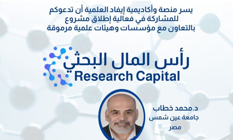 عقدت منصة وأكاديمية الباحثين والأكاديميين(إيفاد) بالتعاون مع الاتحاد العربي للتنمية المستدامة والبيئة والمؤسسة القومية للاستشارات والتدريب في جمهورية مصر العربية محاضرة افتراضية لإطلاق المشروع الأول والنوعي بعنوان: “رأس المال البحثي” وذلك مساء اليوم الأحد.