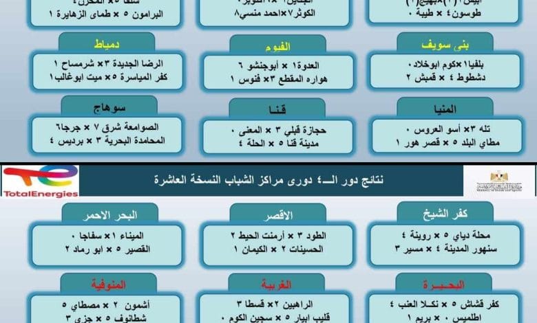 إعلان نتائج نصف نهائي دوري مراكز الشباب توتال انرجيز بالمحافظات