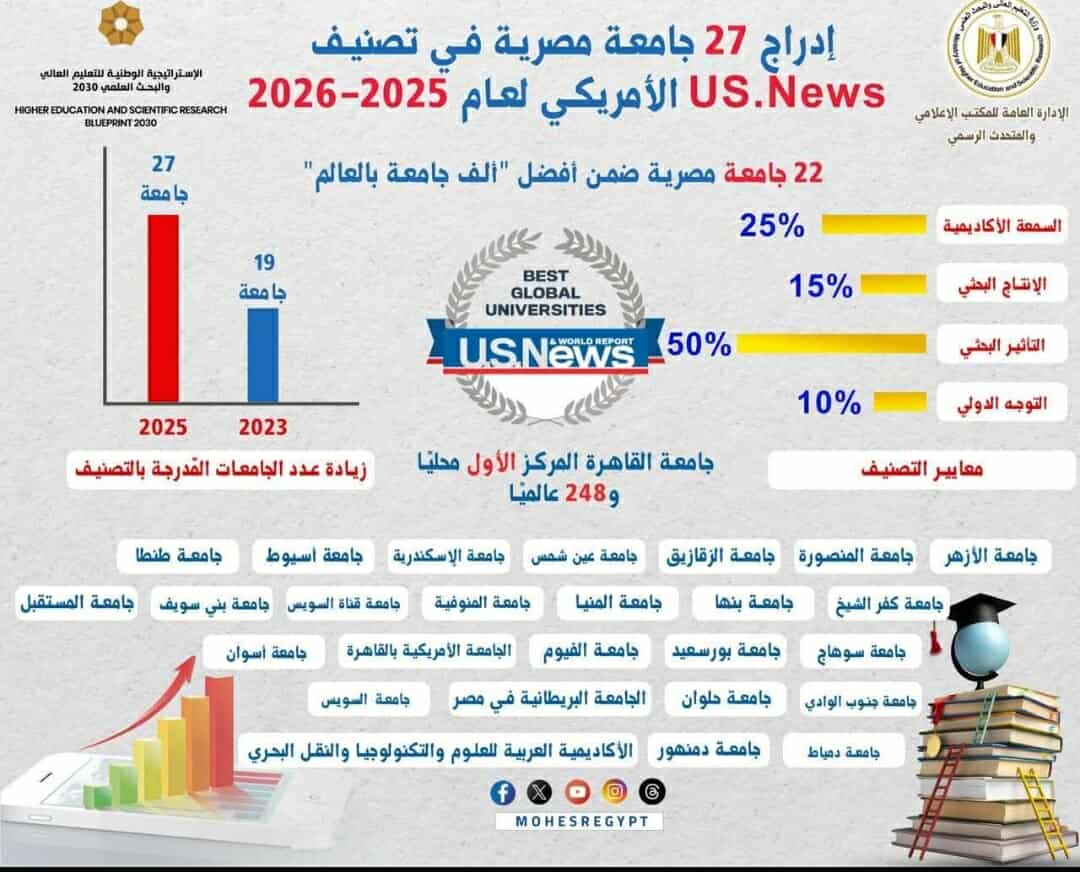 ومن جانبه، قال الدكتور محمود السعيد نائب رئيس الجامعة لشئون الدراسات العليا والبحوث، أن ترتيب جامعة القاهرة يتقدم سنويًا داخل التصنيف الأمريكي«US-News» حيث جاءت عام 2017 في الترتيب 450 عالميًا، وفي عام 2018 في الترتيب 448 عالميًا، وفي عام 2019 في الترتيب 434 عالميًا، وفي عام 2020 في الترتيب 427 عالميًا، وفي عام 2021 في الترتيب 392 عالميًا، وفي عام 2022 جاءت في الترتيب 363 عالميًا، وفي عام 2024 في الترتيب 271 عالميًا، حتي أصبحت الجامعة عام 2025 في الترتيب 248 عالميًا.