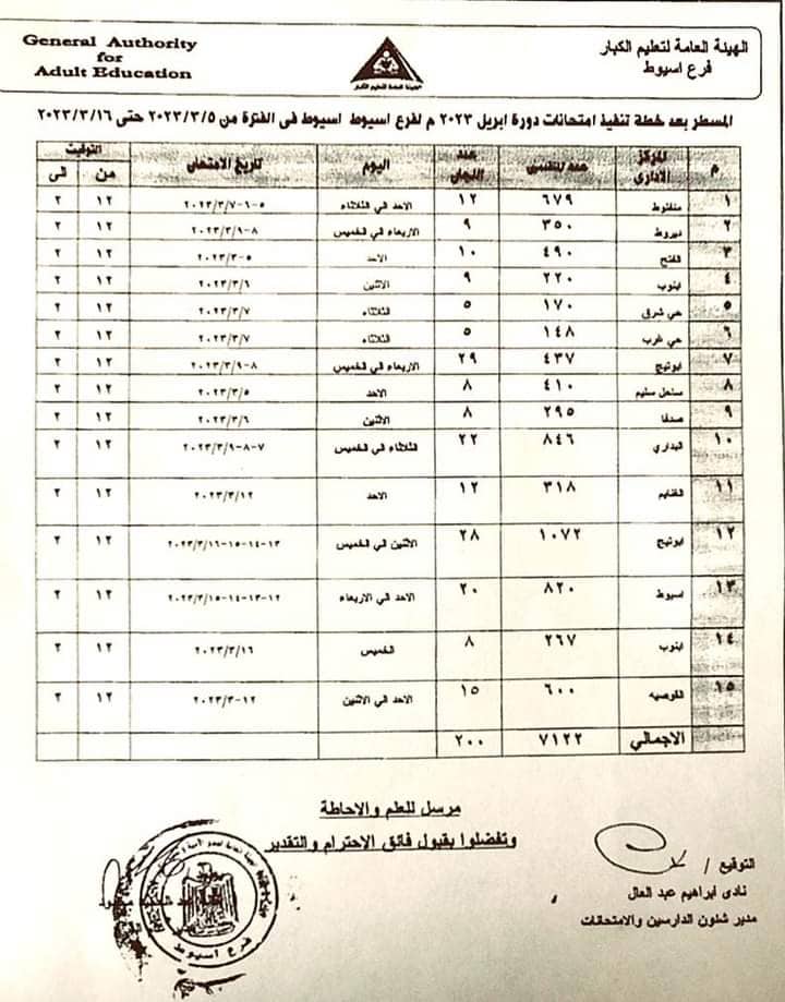 أن امتحانات دورة أبريل 2023 بالمراكز الإدارية والأحياء تبدأ في الفترة من 5 مارس إلى 9 مارس ومن 12 مارس إلى 16 مارس حيث بلغ عدد المتقدمين في مركز منفلوط 679 دارس يؤدون الامتحان في 12 لجنة أيام 5-6-7/3/2023 وفي ديروط 350 متقدم في 9 لجان يؤدون الامتحان أيام 8-9/3/2023 وفي الفتح 490 متقدم يؤدون الامتحان في 10 لجان يوم 5 مارس أما في أبنوب تقدم 220 دارس يؤدون الامتحان في 9 لجان يوم 6 مارس وحي شرق بلغ عدد المتقدمين 170 دارس في 5 لجان يوم 7 مارس وحي غرب 148 متقدم في 5 لجان يوم 7 مارس وفي أبوتيج 437 متقدم في 29 لجنة يومي 8-9/3/2023 بينما في ساحل سليم 410 متقدم يؤدون الامتحان في 8 لجان يوم 5 مارس وفي صدفا 295 متقدم في 8 لجان يوم 6 مارس أما في البداري بلغ عدد المتقدمين للامتحان 846 دارس يؤدون الامتحان في 22 لجنة أيام 7-8-9/3/2023 وفي الغنايم 318 متقدم في 12 لجنة يوم الأحد 12 مارس وأبوتيج 1072 دارس في 28 لجنة أيام 13-14-15-16/3/2023 وفي مركز أسيوط 820 متقدم في 20 لجنة أيام 12-13-14-15/3/2023 والقوصية 600 متقدم في 15 لجنة يوم 12 مارس وفي أبنوب يؤدي 267 دارس الامتحان في 8 لجان يوم الخميس 16 مارس 2023.