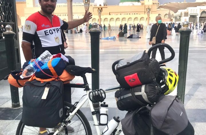 ظل الحلم يراودني ويخطر ببالي آلاف المرات وجلست كثيرا وكثيرا اخطط له واحلم به و بتحقيقة ولكن في الوقت الذي يريد الله لا في الوقت الذي اريده أنا قمت بإعداد متعلقاتي الشخصيه وكل ما احتاج من معدات لدراجتي فالوقت ضيق جدا توجهت إلي ميناء سفاجا أحد مدن البحر الأحمر مرورا بمدن العين السخنه والزعفران والغردقة وفي العاشرة صباحا كانت مدينه سفاجا في استقبالي وبعد دخولي للميناء وقضاء مايقرب من ٢١ ساعه وصلت للحلم الذي طالما يخطر ببالي مدينه ضبا حيث المملكه السعودية وقمت بالتوجه للمدينه وقضاء يومي فيها وفي الصباح توجهت لمدينة الوجه ومنها الي مدينه املج في اليوم الثالث ثم ينبع ثم بدر المدينة التي قامت فيها أولي غروات الرسول أمام المشركين وقمت بزيارة المدينه وتوجهت منها إلي المدينه المنوره الحلم الكبير الذي توقفت كثيرا أمامه بدراجتي وقضيت ساعات أمام المسجد النبوي الشريف أتأمل في جمال المدينه وكيف والمشقة التي واجهتني في رحلتي من مسافات طويله في صحراء جرداء ومبيت في الخيام والمساجد ولطف من الله وكرم من أهل البلد بمختلف جنسياتهم ثم توجهت للفندق للراحة وتناول الغذاء وبدا جولاتي داخل المدينه بزيارة موقع غزوة احد فقد قال النبي صلي الله عليه وسلم أحد جبل يحبنا ونحبه ومنها إلي مسجد ذات القبلتين الذي تحولت فيه قبلة المسلمين وقضيت صلاة العصر فيها ثم توجهنا لمسجد قباء أول مسجد بني في الإسلام وفي الايام التاليه قمت بالتجول في أسواق المدينه وزيارة مجمع الملك فهد لطباعة المصحف الشريف قضينا في المدينه مايقرب من سته أيام كانت بين الحلم والخيال وكأنك سافرت عبر الزمان واستكملت رحلتي إلي أجمل بقاع الأرض بيت الله الحرام اول بيت وضع للناس
