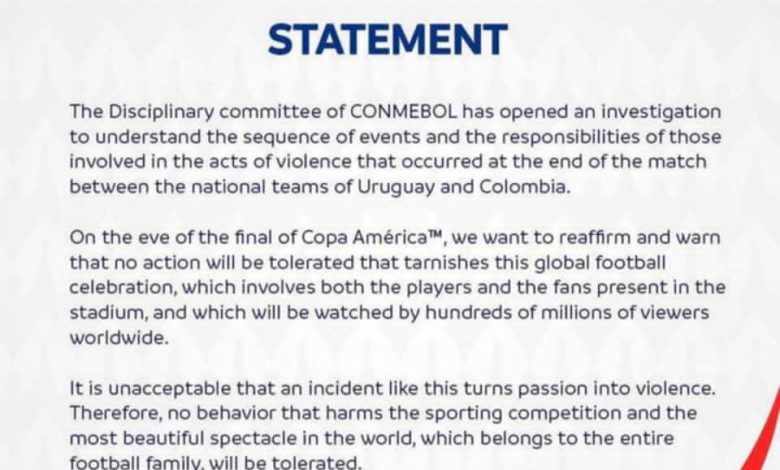 وجاء في البيان الرسمي لـ اتحاد أمريكا الجنوبية لكرة القدم: “فتحت اللجنة التأديبية في اتحاد أمريكا الجنوبية لكرة القدم (كونميبول) تحقيقا لفهم تسلسل الأحداث ومسؤوليات المتورطين في أعمال العنف التي وقعت في نهاية المباراة بين منتخبي الأوروغواي وكولومبيا”.