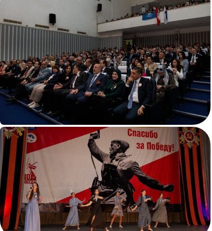 احتفلت السفارة الروسية بالقاهرة بعيد النصر ال 80 بمسرح المركز الثقافي الروسي بالقاهرة بحضور السفير الروسي جيورجي بوريسينكو،وسفراء دول بيلاروس،وكازاخستان وارمينيا واذربيجان ومنغوليا صربيا ، كما شارك د.ابراهيم كامل رئيس جمعية الصداقة المصرية الروسية ،والسفير عزت سعد مدير المجلس المصري للتعاون الخارجي ، والمستشار عدلى حسين محافظ القليوبية السابق ،وارسيني ماتيوشينكو القائم بأعمال مدير المراكز الثقافية الروسية في مصر ،وشريف جاد رئيس الجمعية المصرية لخريجي الجامعات الروسية والسوفيتية، ود.اشرف عطية وكيل كلية الالسن جامعة عين شمس ، ود.دينا محمد رئيس قسم اللغة الروسية بجامعة عين شمس، ود.محمد نصر الجبالي عميد كلية الالسن بجامعة الاقصر الاسبق واستاذ الادب واللغة الروسية.
