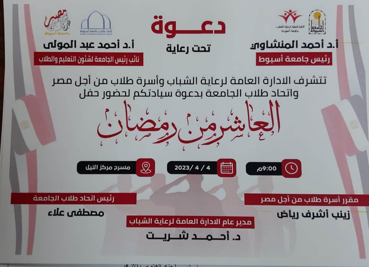 اعلن الدكتور أحمد المنشاوى رئيس جامعة أسيوط عن تنظيم جامعة أسيوط احتفالية كبرى بمناسبة انتصارات العاشر من رمضان غدا الإثنين الموافق ٥ أبريل ٢٠٢٣ بمسرح مركز النيل للتنوير و الإشعاع الحضاري بجامعة أسيوط فى تمام الساعة التاسعة مساءً.