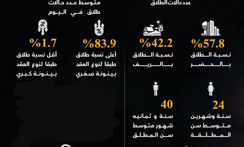 وسجلت أعلى نسب الطلاق بين الرجال في الفئة العمرية من 35 إلى أقل من 40 عامًا، بينما تركزت بين النساء في الفئة من 25 إلى أقل من 30 عامًا، مع غلبة واضحة للحاصلين على التعليم المتوسط في معدلات الطلاق.
