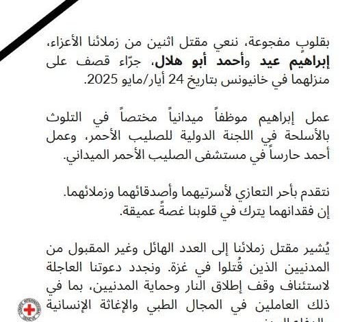 أعلنت اللجنة الدولية للصليب الأحمر، اليوم، عن مقتل اثنين من موظفيها جراء قصف إسرائيلي استهدف منزلهما في مدينة خان يونس جنوب قطاع غزة، في جريمة جديدة تُضاف إلى سجل الاعتداءات الإسرائيلية المستمرة على المدنيين والعاملين في المجال الإنساني.