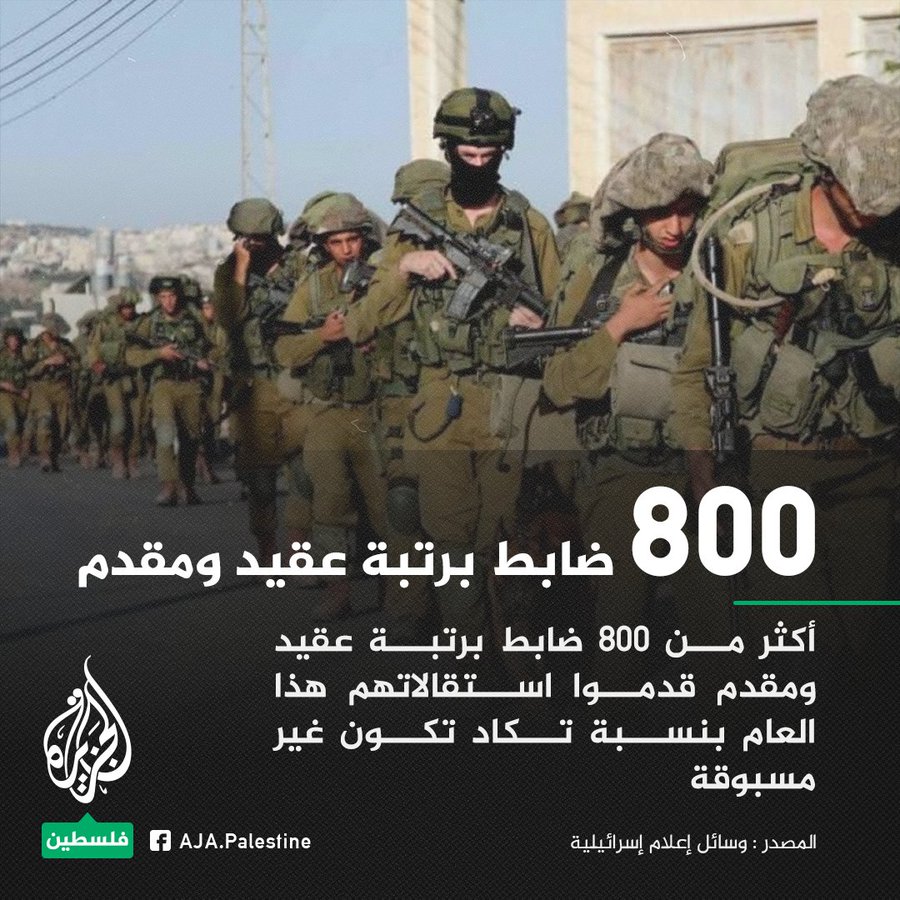 نقلت قناة الجزيرة عن وسائل إعلام اسرائيلية ان أكثر من 800 ضابط برتبة عقيد ومقدم قدموا استقالاتهم هذا العام بنسبة تكاد تكون غير مسبوقة.