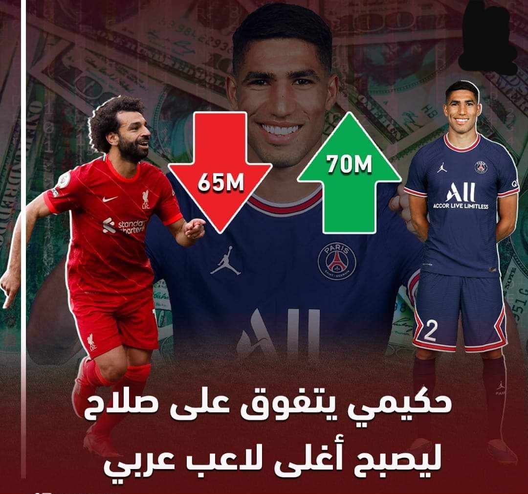 اشراف حكيمي لايزال متجاوزا محمد صلاح في القيمة التسويقية لاغلي لاعب عربي