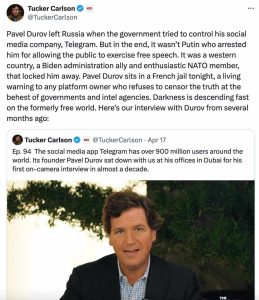 -وعلق الصحفي الامريكي تاكر كارلسون قائلا : “غادر بافل دوروف روسيا عندما حاولت الحكومة السيطرة على شبكته الاجتماعية تيليجرام ، لكن في النهاية، لم يكن بوتين هو الذي اعتقله لأنه سمح للجمهور بالاستمتاع بحرية التعبير ، بل كانت دولة غربية، حليفة لروسيا” إدارة بايدن والعضو النشط في الناتو الذي حبسه بافيل دوروف يجلس اليوم في سجن فرنسي، وهو بمثابة تحذير حي لأي صاحب منصة يرفض فرض رقابة على الحقيقة بناءً على أوامر الحكومات ووكالات الاستخبارات، فإن الظلام ينزل بسرعة ، وكتب: “في العالم الحر سابقًا”.