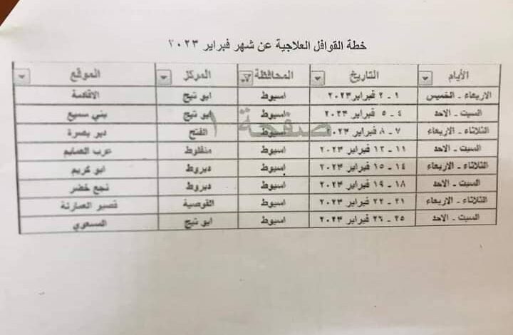 اعلان خطة القوافل الطبية المجانية لشهر فبراير بقرى اسيوط
