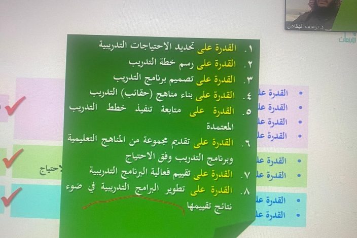 وأكد الشيخ الدكتور يوسف الهقاص من خلال محاضرته التي استمرت ساعتين عبر منصة زووم على أهمية تحديد الاحتياجات التدريبية كإجراء حيوي داخل أي مؤسسة تقوم به إدارة الموارد البشرية، أو الإدارة المختصة ، لافتاً إلى أن مواكبة المستجدات والتغيرات التي تطرأ على سوق العمل وما نشهده من تغيرات تكنولوجية مفاجئة يدفع الإدارة دائمًا إلى تلبية متطلبات المؤسسة في كوادرها البشرية ، لذلك يجب أن تُحدد احتياجات الموظفين في التدريب والتطوير؛ من أجل أن توفر كافة العوامل المطلوبة لنجاح العمل داخل المؤسسة.