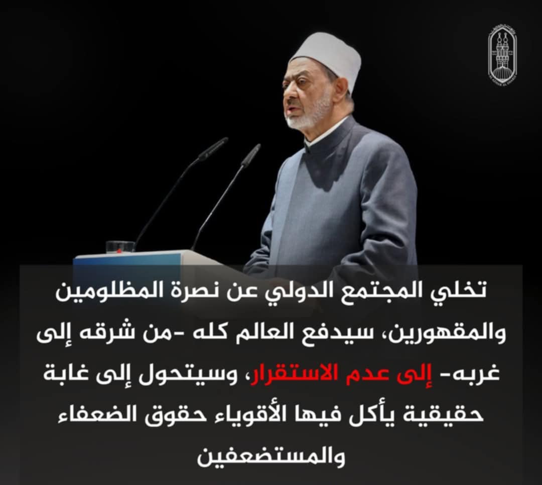 وحذر الأزهر من أن تخلي المجتمع الدولي عن نصرة المظلومين سيؤدي إلى حالة من عدم الاستقرار العالمي، وسيدفع العالم إلى فوضى تشبه عصور ما قبل التاريخ، حيث يأكل الأقوياء حقوق الضعفاء.