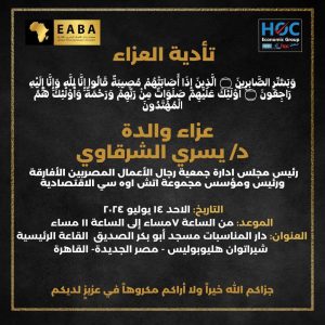 تقدما من الأسرة الصحفية الكاتبة نجوي رجب، والكاتب إبراهيم عوف بواجب العزاء في المغفور لها بإذن الله تعالى السيدة أنوار إسماعيل عبد الحميد والدة الدكتور يسري الشرقاوي رئيس جمعية رجال الأعمال المصريين الأفارقة ورئيس ومؤسس مجموعة HOC الاقتصادية.