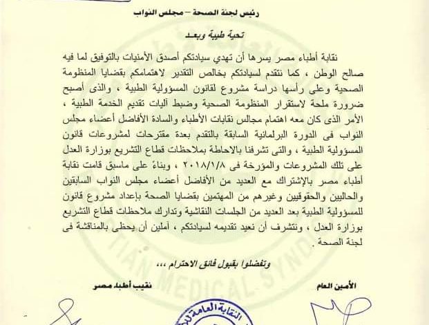 تقدمت نقابة أطباء مصر إلى مجلس النواب بمشروع “قانون المسؤولية الطبية”، حيث قام أ.د. حسين خيري نقيب الأطباء بمخاطبة أ.د. أشرف حاتم رئيس لجنة الصحة بمجلس النواب بنسخة كاملة من مشروع القانون الذي أعدته النقابة، و أكد خيري في خطابه الموجه اليوم الأربعاء 20 أكتوبر إلى رئيس لجنة الصحة على الضرورة الملحة لتشريع هذا القانون، حتى تستقيم المنظومة الصحية و يتم ضبط آليات تقديم الخدمة الصحية.