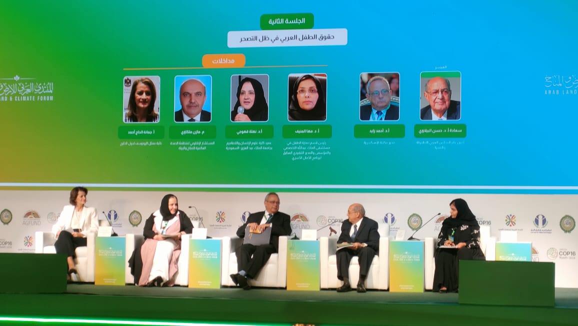 وفي إطار أعمال المنتدى – الذي يستمر يومي 8 – 9 أكتوبر 2024 ويضم عددا من الجلسات العلمية – نظمت جلسة خاصة حول “حقوق الطفل العربي في ظل التصحر”، والتي تناولت مفهوم التصحر كعملية تسهم في تدمير البيئة وتنتج تأثيرات سلبية طويلة المدى، وكيف أن المنطقة العربية تعد من المناطق الأكثر هشاشة في نظامها البيئي باعتبار أن 90 % من أراضيها تعد جافة أو مهددة بالجفاف، وأن 73% منها مهدد بالتآكل والتصحر.