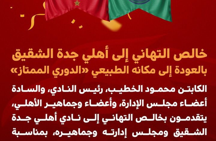 وكتب الحساب الرسمي للنادي الأهلي عبر موقع “تويتر” للتواصل الاجتماعي يقول : الكابتن محمود الخطيب رئيس النادي ،والسادة أعضاء مجلس الأدارة ، وأعضاء وجماهير النادي الأهلي يتقدمون بخالص التهاني الى نادي أهلي جدة الشقيق ومجلس ادارته وجماهيره بمناسبة عودته إلى مكانه الطبيعي بالدور الممتاز “.