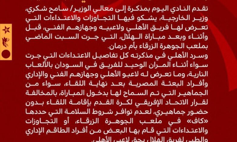 تقدم النادي الأهلي اليوم الاثنين العشرين من فبراير 2023 بمذكرة إلى الوزير/ سامح شكري، وزير الخارجية، يشكو فيها التجاوزات والاعتداءات التي تعرض لها فريق الأهلي ولاعبيه وجهازهم الفني، قبل وأثناء وبعد مباراة الهلال، التي جرت السبت الماضي بملعب الجوهرة الزرقاء بأم درمان.