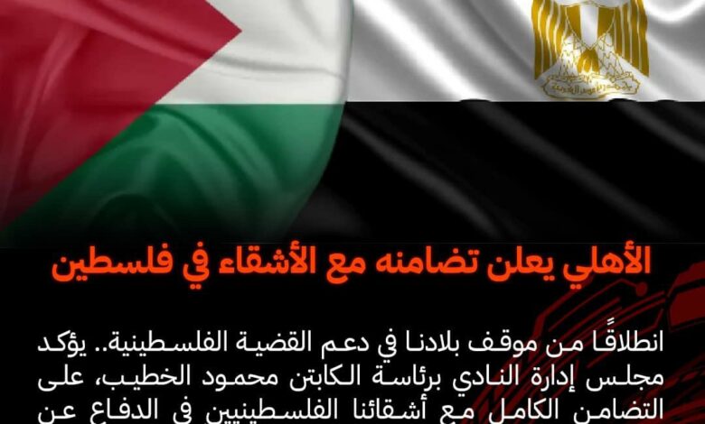 “انطلاقًا من موقف بلادنا في دعم القضية الفلسطينية.. يؤكد مجلس إدارة النادي برئاسة الكابتن محمود الخطيب، على التضامن الكامل مع أشقائنا الفلسطينيين في الدفاع عن حقوقهم المشروعة ووطنهم الغالي.. ويدعو الله -عز وجل- أن يتغمد شهداءهم بواسع رحمته، ويمن على المصابين بالشفاء العاجل’