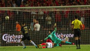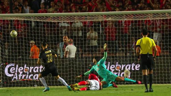 وسدد معلول المخالفة لتصطدم في الحائط البشري ويحتسب الحكم الليبي معتز إبراهيم ركلة جزاء للأهلي.