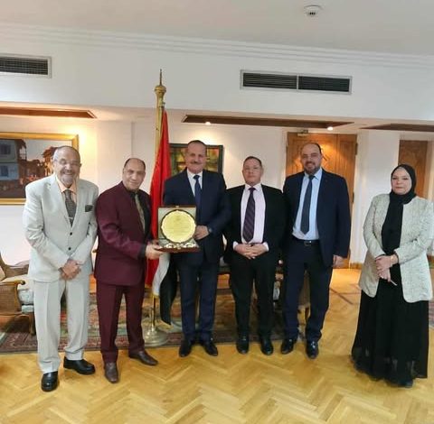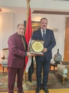 في ختام اللقاء، أهدى المهندس إسماعيل أحمد علي درع الاتحاد إلى الدكتور أشرف العزازي تكريماً لدوره الإبداعي والوطني الذي امتد لعقود، حيث نجح في تحقيق تواصل ثقافي وتعليمي وإنساني فريد، وجمع بين الأصالة والمعاصرة في خدمة الثقافة المصرية. وأكد أن هذا التكريم يمثل وثيقة تقدير لمكانة العزازي الذي ساهم في الحفاظ على الإرث الثقافي والإبداعي المصري، ودعم حضور الفنون والثقافة المصرية إقليمياً ودولياً.