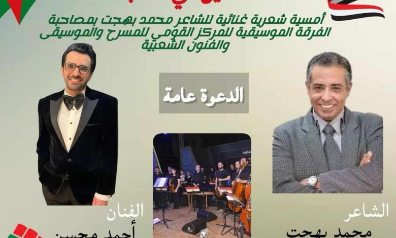تحت رعاية الأستاذة الدكتورة نيفين الكيلاني وزيرة الثقافة، وإشراف رئيس قطاع شئون الإنتاج الثقافي المخرج الكبير خالد جلال. يقيم المركز القومي للمسرح والموسيقى والفنون الشعبية برئاسة الفنان القدير إيهاب فهمي؛ أمسية شعرية غنائية بعنوان”فلسطين في القلب” تحييها فرقة المركز الموسيقية بمشاركة الشاعر الكبير محمد بهجت.