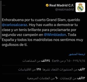 *’ نادي ريال مدريد يقدم التهنئة لـ “كارلوس ألكاراز” عبر منصته الإلكترونية.