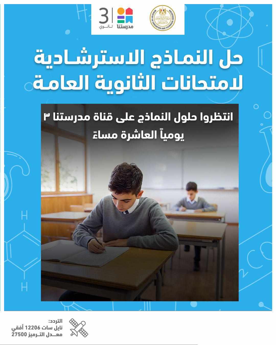 كما تعلن الوزارة إتاحة حل النماذج الاسترشادية عبر قناة “مدرستنا ٣”، حيث يخصص يوم لكل مادة، وذلك فى تمام الساعة العاشرة مساء يوميا، على أن تكون الإعادة فى تمام الساعة العاشرة صباح اليوم التالي، وذلك عبر تردد القناة على النايل سات 12206 أُفقي معدل ترميز 27500.