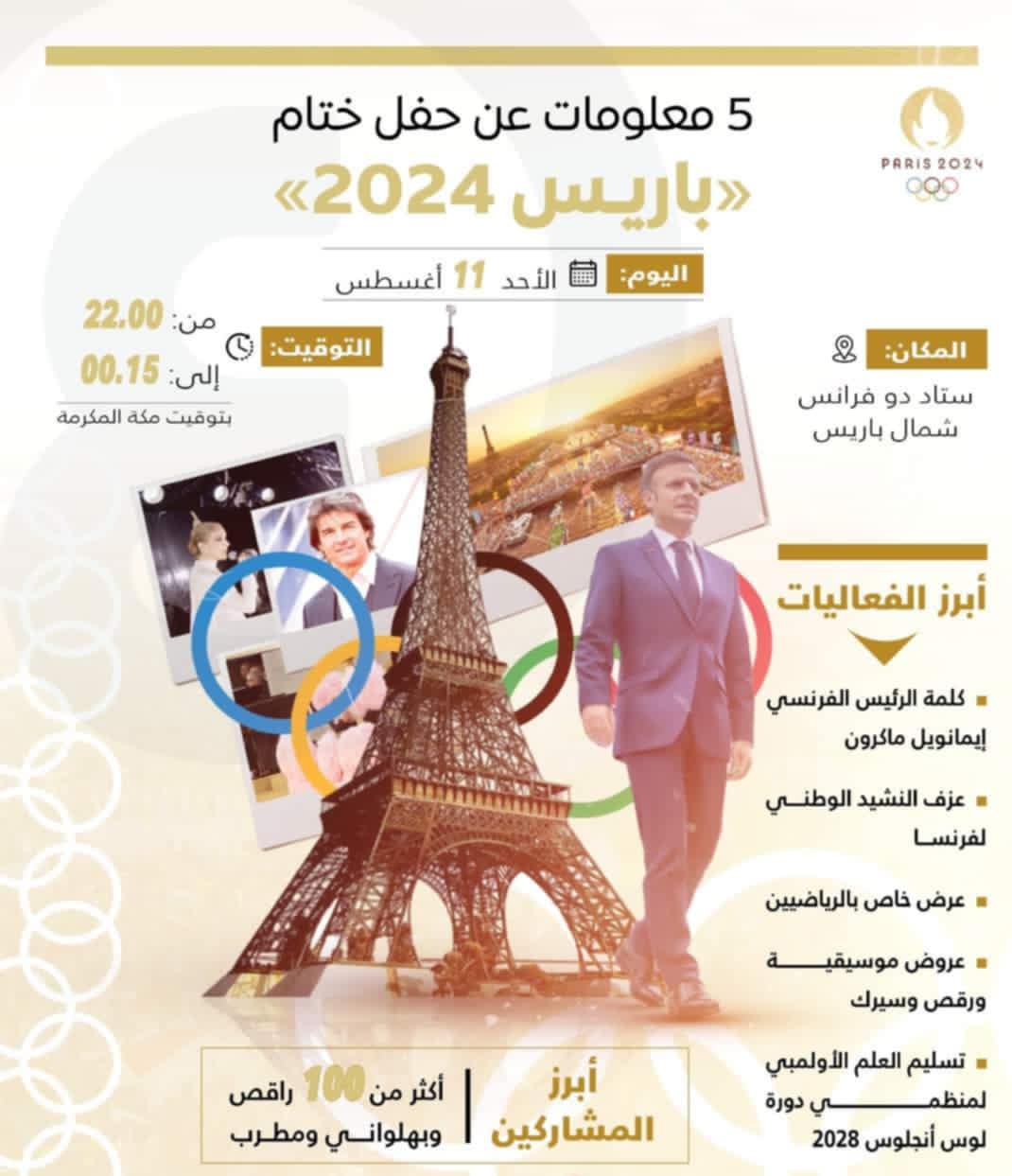 سيتم عرض أبرز الأحداث التقليدية المعتاد عليها في حفل الختام الخاص بأولمبياد باريس 2024 مثلما كان الحال في الدورات السابقة.